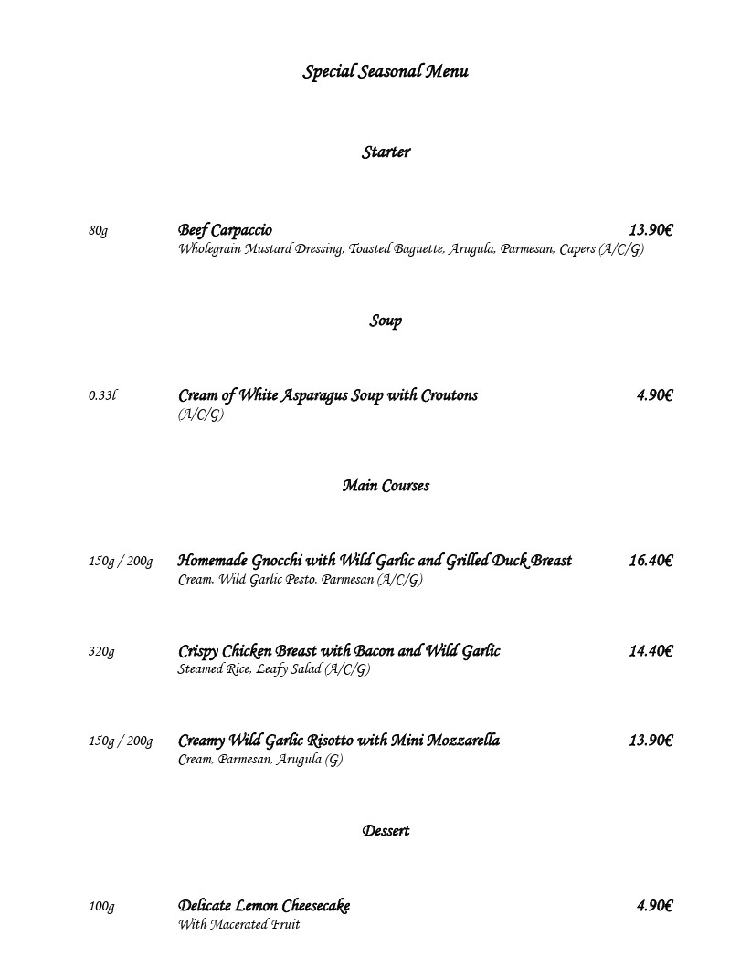 Special Seasonal Menu